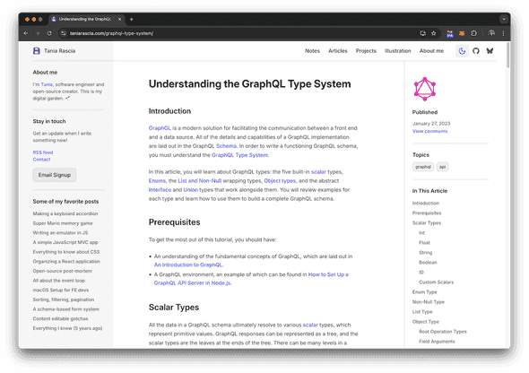 I also have a secondary sidebar on the article pages with the date, tags, and table of contents. It uses the IntersectionObserver API to detect when each section scrolls into view.
